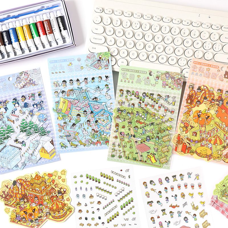 Four Seasons Amusement Park 3D Scene Sticker 4 Theme Sets: Spring Park | Water Park | Autumn Amusement Park | Winter Wonderland